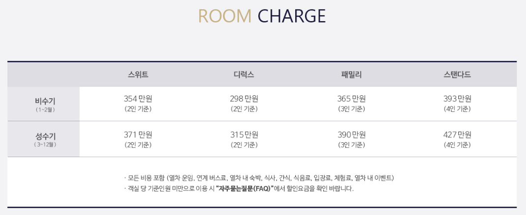 열차 + 전용버스 + 전 일정 객실 + 식사 6식 + 관광지 입장 + 기차 내 공연 및 이벤트 - 객실 구성:
