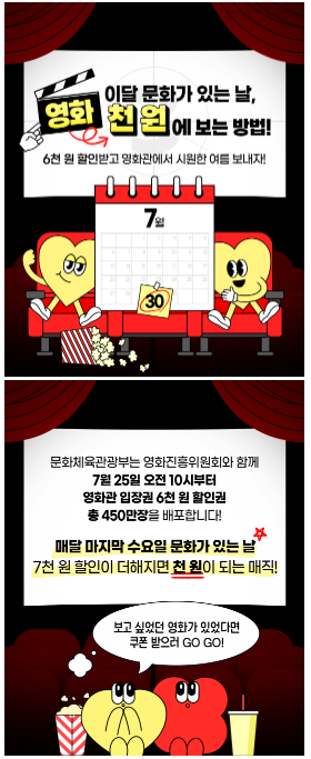 “매달 마지막 주 수요일, 정부 할인 쿠폰과 문화가 있는 날 요금만 잘 챙기면 단돈 1,000원에 최신 영화를 즐길 수 있어요!”