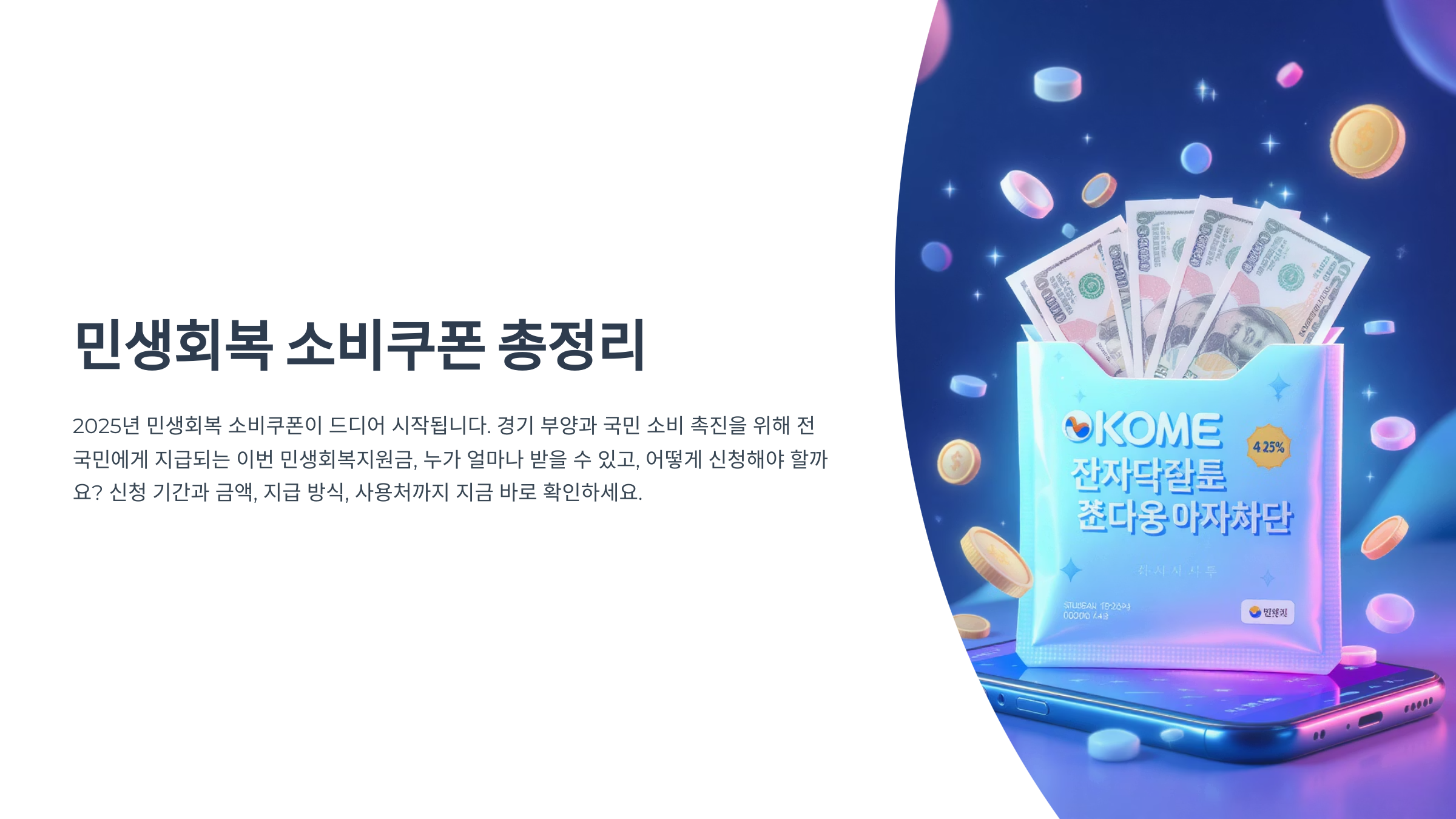 2025년 민생회복 소비쿠폰이 드디어 시작됩니다. 경기 부양과 국민 소비 촉진을 위해 전 국민에게 지급되는 이번 민생회복지원금, 누가 얼마나 받을 수 있고, 어떻게 신청해야 할까요? 신청 기간과 금액, 지급 방식, 사용처까지 지금 바로 확인하세요.