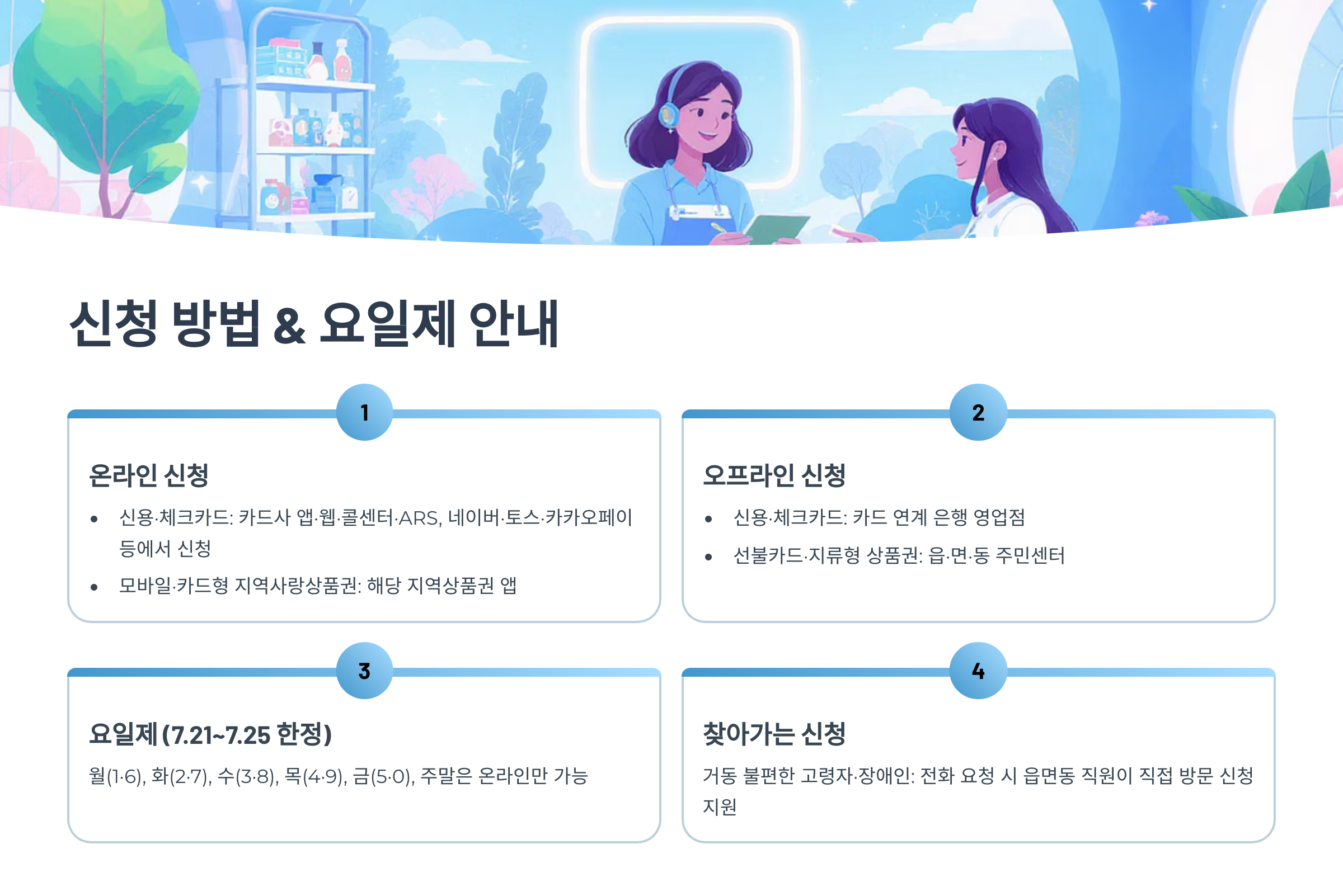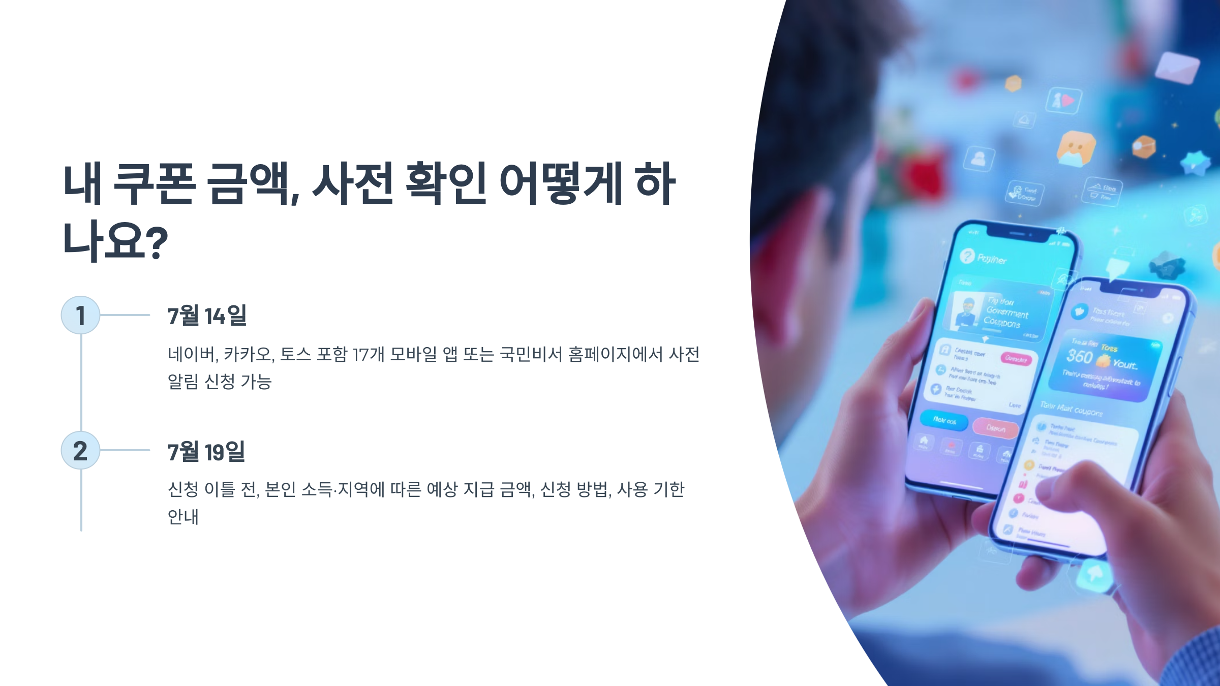 - 7월 19일: 신청 이틀 전, 본인 소득·지역에 따른 예상 지급 금액, 신청 방법, 사용 기한 안내