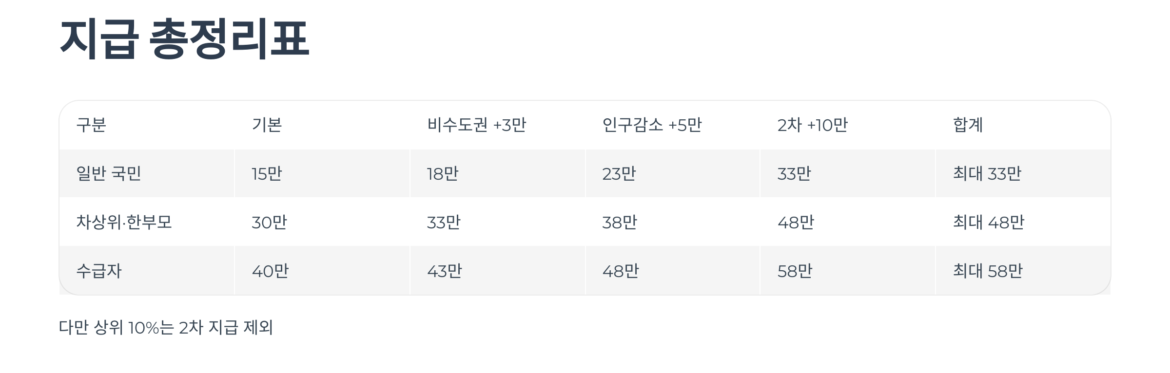 📌 예시: 일반 국민이 농어촌 인구감소지역에 거주하면, 1차에 총 15 + 5 = 20만 원을 받게 됩니다.