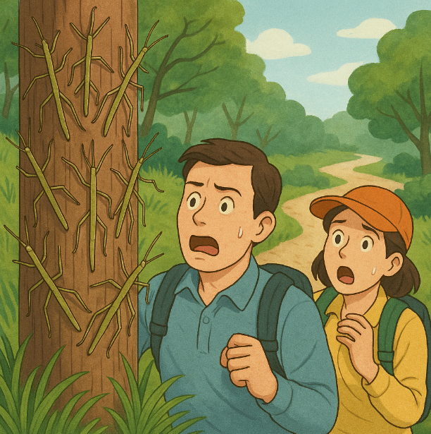 나뭇가지처럼 생긴 길쭉한 곤충들이 표지판, 나무줄기, 심지어 벤치까지 가득 메우고 있죠.