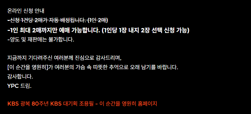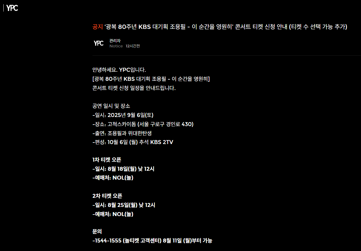 - 공연명: 광복 80주년 KBS 대기획 ‘이 순간을 영원히 – 조용필’