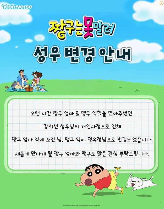 “건강상의 이유로 '짱구는 못말려' 봉미선 역할에서 하차하게 되었습니다.”